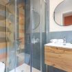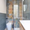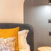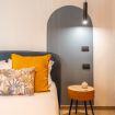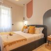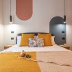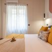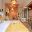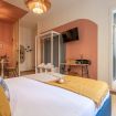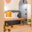 La suite è caratterizzata da un'atmosfera luminosa e accogliente, arricchita dai toni delicati del rosa pesco e del giallo, che creano un ambiente raffinato e rilassante. Il pavimento in ceramica effetto parquet aggiunge un tocco di eleganza, mentre il bagno rivestito con piastrelle colorate è un vero e proprio gioiello che aggiunge un tocco di vivacità.